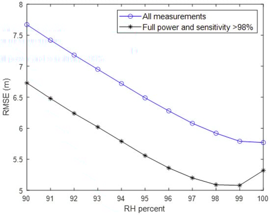 RMSE analysis between GEDI RH metrics and airborne LiDAR CHM. The blue line shows the calculation results using all measured values. The black line indicates the calculated results using only selected points that satisfy the full power and sensitivity conditions.