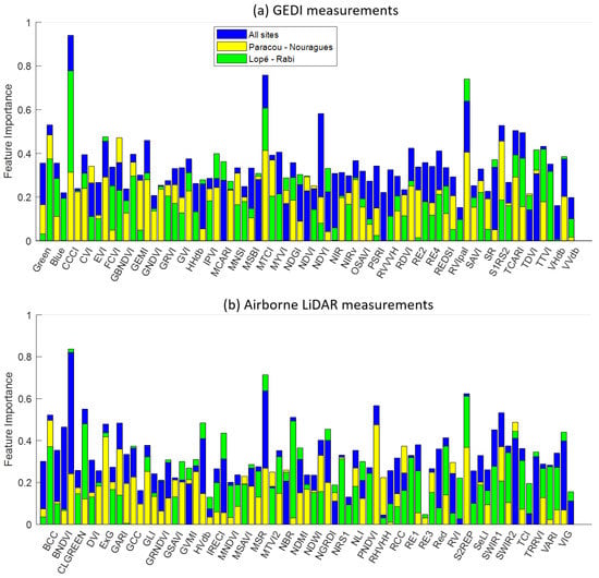 Feature importance in order as in Table 1 from the random forest for all sites (Paracou, Nouragues, Lopé, and Rabi), South America (Paracou-Nouragues), and Africa (Lopé-Rabi). (a) GEDI; the horizontal label feature is in odd numbers (see Table 1). (b) Airborne LiDAR; the horizontal label feature is in even numbers.