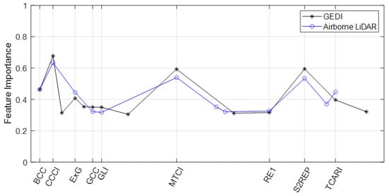 Proposed feature selection. Feature importance trained from GEDI data in all sites is reported. Stability index in both airborne LiDAR and GEDI: (2) BCC (blue chromatic coordinate), (5) CCCI (canopy chlorophyll content index), (10) ExG (excess green index), (14) GCC (green chromatic coordinate), (16) GLI (green leaf index), (33) MTCI (MERIS terrestrial chlorophyll index), (54) RE1 (red edge 1), (62) S2REP (Sentinel-2 red-edge position), and (69) TCARI (transformed chlorophyll absorption in reflectance index).