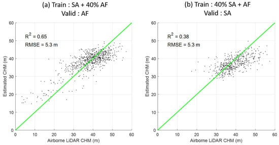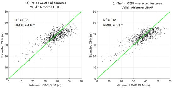 The predicted CHM performance with respect to airborne LiDAR. (a) training by GEDI and total features. (b) training by GEDI and only nine selected features: BCC, CCCI, ExG, GCC, GLI, MTCI, RE1, S2REP and TCARI.