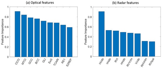 Feature importance in descending order. (a) Optical selected features: CCCI, MTCI, GCC, BCC, GLI, ExG, TCARI, RE1, S2REP. (b) Radar features: HVdb, VHdb, RVI, HHdb, RVVVH, VVdb, RHVHH, RVIpal.