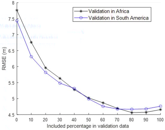 To test the robustness of the selected optical and radar features in two different continents, we used 464 points from South America (Paracou and Nouragues) for training and 702 samples from Africa (Lopé and Rabi) for validation, and vice versa. However, the performance was not good because of the different CHM distribution (see right panels in Figure 1). We improved this situation by including a certain percentage from validation data in training (see Figure 9). The result, including 40%, was reported in Figure 10. The cross-validation RMSE values used a similar metric.