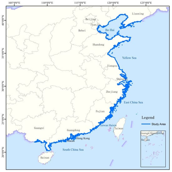 The coastline along the mainland of China extends from the mouth of the Yalu River on the China–North Korea border to the north of the Beilun River on the China–Vietnam border in the south. It covers 12 major provinces, municipalities, autonomous regions, and special administrative regions, including Liaoning, Hebei, Tianjin, Shandong, Jiangsu, Shanghai, Zhejiang, Fujian, Guangdong, Hong Kong, Macao, and Guangxi provinces (Figure 1). About 42% of the population and 60% of the GDP of China are concentrated in these provinces and cities.