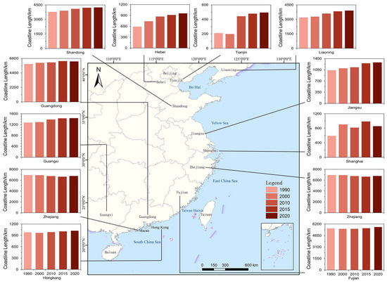 China has become the world’s second-largest economy in the course of decades of development, and its coastal zone is one of the fastest-growing and most economically dynamic regions in the world. The coastal provinces and cities occupy more than 70% of the country’s large and medium-sized cities and nearly 40% of its population, generating more than 61% of the country’s gross national product [30]. Along with the rapid development of China’s coastal zone, its coastline has undergone dramatic changes during these decades, with human activities being the main factor behind the dramatic coastline changes. Since the early 20th century to 2014, the structure of China’s mainland coastline has changed significantly, with the proportion of artificial coastline increasing to 67% [5].