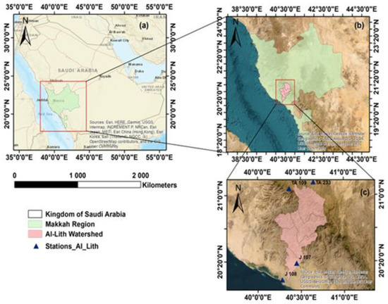 Geographical location of the Al-Lith Watershed: (a) Kingdom of Saudi Arabia; (b) Makkah Region; and (c) the Al-Lith Watershed.