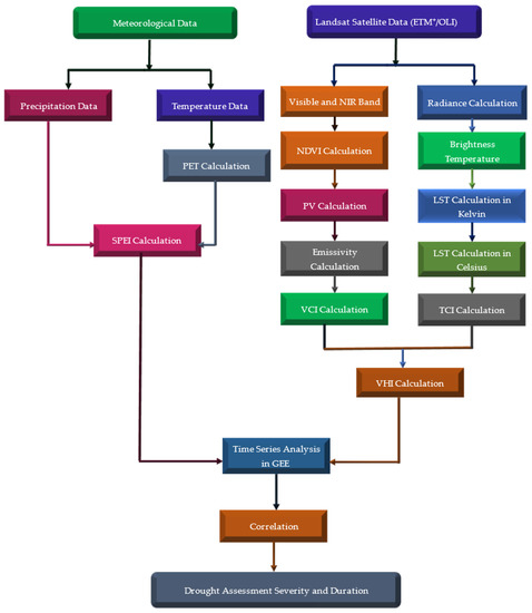 The methodology used in this study is categorized into; (i) meteorological data acquisition, (ii) satellite data retrieval, (iii) meteorological drought monitoring using SPEI, (iv) drought monitoring using remotely sensed drought indices (i.e., VCI, TCI, and VHI), (v) temporal and geospatial analyses of the above indices using GEE, and (vi) correlation between SPEI and remote sensing drought indices. The workflow for this study is shown in Figure 2.