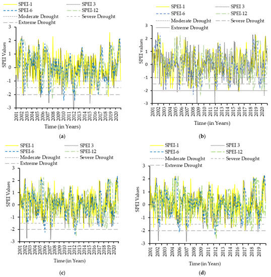 Figure 3 shows the SPEI time series at different time scales (i.e., 1-, 3-, 6-, and 12-months) at stations J107, J108, TA-109, and TA-233 from 2001 to 2020 in the Al-Lith watershed. Figure 3a shows that more severe and extreme drought events are observed by SPEI-3, followed by SPEI-12 and SPEI-6, whereas SPEI-1 shows moderate to severe drought conditions. However, high fluctuations are observed in SPEI-1 and SPEI-3 time series compared to SPEI-6 and SPEI-12. Moreover, the time series analyses depict severe to extreme drought events in 2002, 2003, 2007, 2011, 2015, 2017, and 2019 (Figure 3a). Overall, the time series plot shown in Figure 3b demonstrates more severe to extreme drought events in 2003, 2007, 2009, 2012, 2016, 2019, and 2020. Further, drought at stations TA109 (Figure 3c) and TA233 (Figure 3d) are more severe at 3- and 12-month time scales followed by SPEI-6 and SPEI-1. Extreme and severe drought events at station TA109 are observed in 2002, 2007, and 2012. Likewise, severe to extreme drought events at station TA233 are observed in 2005, 2006, 2009, 2012, and 2019. Overall, the results (Figure 3a–d) demonstrate significant numbers of extreme and severe drought events in 2002, 2007, 2009, 2012, 2015, and 2019 in the Al-Lith watershed.