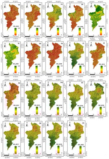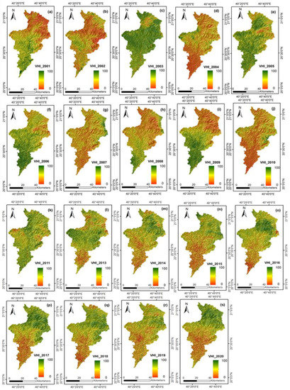 (a–s) Spatial distribution of VCI in Al-Lith Watershed retrieved from Landsat Satellites for the period of 2001–2020.