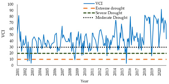 Figure 4 and Figure 5 show the spatial and temporal distribution of VCI from 2001 to 2020 in the Al-Lith Watershed, which is calculated from the NDVI, shown in Figure A1 in Appendix A. The spatial distribution maps of VCI (Figure 4) indicate that 2001, 2002, 2004, 2007, 2008, 2010, and 2011 are the extreme drought years in the study period. In contrast, more wet conditions (relatively less drought) are observed in 2005, 2006, 2009, and 2016. Furthermore, it should be noted that drought is relatively more severe in northern areas of the Al-Lith watershed compared to southern areas.