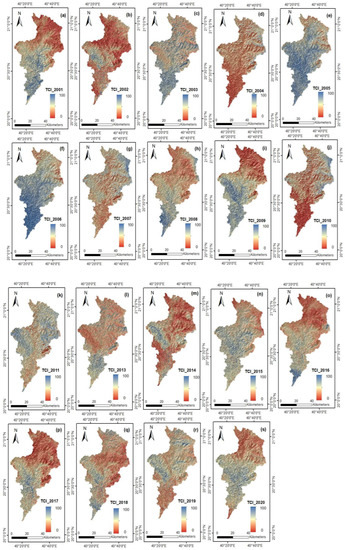 (a–s) Spatial distribution of TCI in Al-Lith Watershed retrieved from Landsat Satellites for the period of 2001–2020.