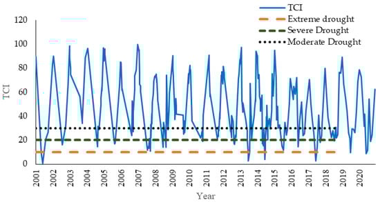 The time series plot of TCI for the Al-Lith watershed is shown in Figure 7. TCI values show that the Al-Lith watershed experienced frequent severe and extreme drought events in 2001, 2002, 2004, 2005, 2007, 2008, 2013, 2014, 2015, 2017, 2019, and 2020. Overall, the mean TCI values across different years ranges from 13.79 to 89.6 in the study area.