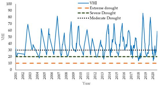 (4) VHI results depicted severe drought events in 2001, 2002, 2004, 2007, 2008, 2010, 2015, 2018, and 2019. The values of VHI ranged from a minimum of 19.47 to a maximum of 64.22. The VHI time series depicted severe and extreme drought events in 2002, 2004, 2007, 2008, 2010, 2012, 2013, 2014, 2015, and 2017–2020.