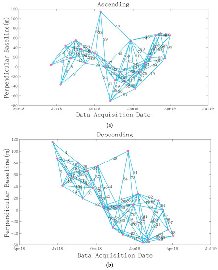 Space–time baseline map of (a) ascending tracks and (b) descending tracks.