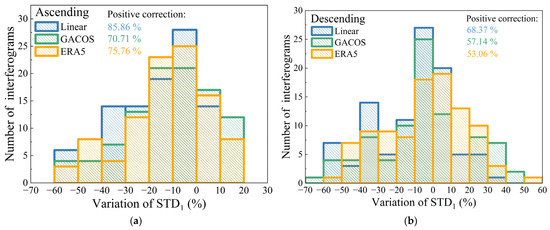 Not all results of the tropospheric delay correction for the original interferogram were valid. After correction, the STD1 of a single interferogram increased, which was an unsatisfactory correction result, called overcorrection. Overcorrection occurred in both ascending and descending track interferogram corrections, as shown in Figure 4 and Figure 5. Table 3 shows the number of tropospheric positive corrections or overcorrections in the interferogram. The STD1 of 85 of the 99 interferograms in the ascending tracks decreased after the Linear correction method, with an average decline rate of −20.79%. The STD1 of the 14 other interferograms increased at an average rate of 2.90%. After correction using the GACOS method, the STD1 of 70 interferograms decreased, at an average of −19.62%, while the other 29 interferograms increased with an average increase of 8.97%. After correction using the ERA5 method, the STD1 of 75 interferograms decreased by −18.69%, while 24 interferograms increased by 7.14%.