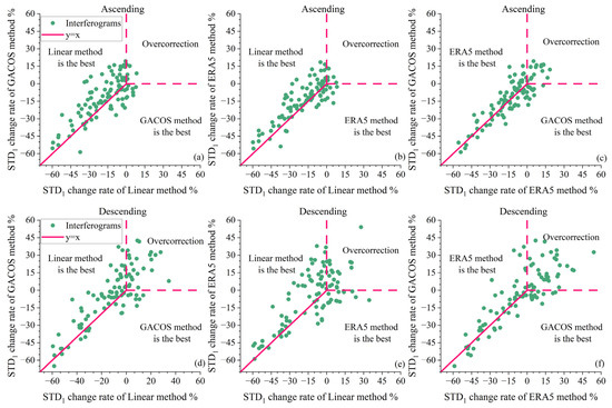 Comparison of tropospheric delay correction methods; (a–f) show the change comparison of the standard deviation of the interference phase (STD1) of the three correction methods for the ascending and descending track interferograms. The green dot represents the interferogram, the negative change rate of the STD1 indicates that the tropospheric delay was alleviated, the positive value represents the overcorrection and the pink realization, and the dashed line represents the dividing line between the optimal correction method and the overcorrected interferogram.