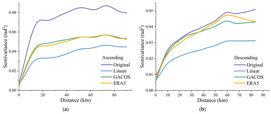 Semi-variogram of the mean value of semi-variance of (a) ascending and (b) descending track interferograms before and after troposphere correction.