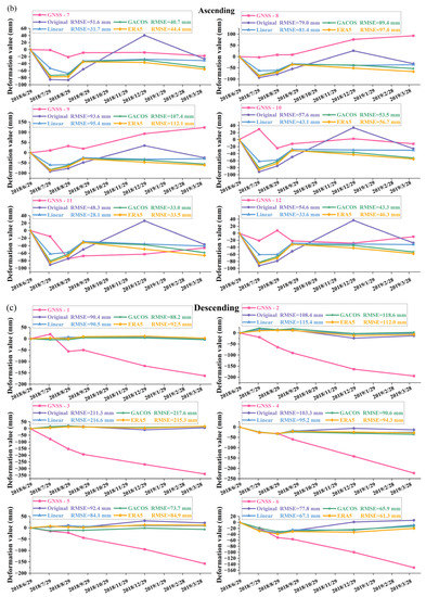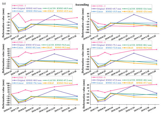 According to the analysis in Table 5, among the ascending track data, the Linear method had the best tropospheric correction effect, and the mean value of RMSE was the lowest, at 55.2 mm, followed by the GACOS method, at 63.6 mm. The ERA5 method could improve the deformation monitoring accuracy of some stations, owing to its greater overcorrection effect. The mean value of RMSE increased from 65.5 mm to 68.3 mm, which also proved that the correction effect of the ERA5 method in different regions fluctuated greatly and had poor stability. For the descending track data, the average RMSE of the Linear, GACOS, and ERA5 methods decreased from 97.6 mm to 90.0 mm, 85.2 mm, and 90.5 mm, respectively. The average RMSE of the GACOS method was the lowest, followed by that of the Linear and ERA5 methods. The mean RMSE values of the three methods decreased. As tropospheric conditions differ greatly in space, GNSS monitoring stations in the study area have a small distribution range and the maximum distance between GNSS monitoring stations is only 990.7 m; hence, the verification of measured data only represented the verification results of tropospheric correction at a small spatial scale.