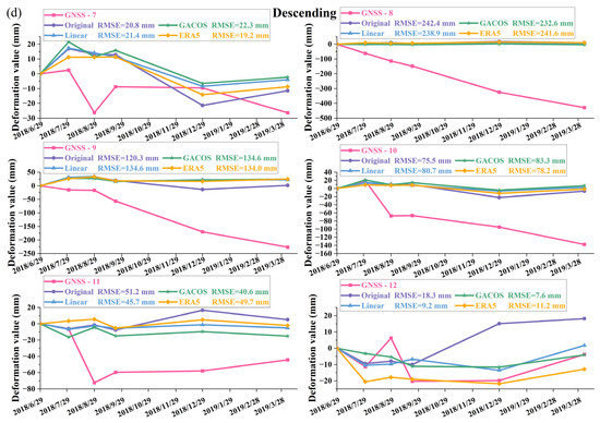 The deformation value of the GNSS was projected back to the LOS, and the relationship between InSAR and GNSS was derived. As shown in Figure 10, when the deformation gradient was small, the GNSS deformation value and trend were consistent with the InSAR deformation monitoring results. The difference between the descending track InSAR deformation value and GNSS monitoring deformation value was large. This may have been because of the high deformation value projected by the GNSS in the LOS direction of the descending tracks, the absolute value of deformation being generally greater than 100 mm, and the high deformation gradient near the GNSS point. This is far beyond the SBAS-InSAR deformation monitoring range of 1 cm/y–1 dm/y [25]. However, as the deformation trend was highly consistent, it did not affect the accuracy of the tropospheric delay correction. The three tropospheric correction methods generally improved the accuracy of InSAR deformation monitoring, among which the monitoring accuracy of sites 2, 7, 10, 11, and 12 in the ascending tracks and sites 4, 5, 6, 8, 11, and 12 in the descending tracks were greatly improved. However, in the vicinity of some GNSS sites, tropospheric delay correction seemed to produce an overcorrection effect, and the deformation monitoring accuracy of InSAR decreased, which also demonstrated that tropospheric conditions in different scale-spaces can have significant differences within the same time period.