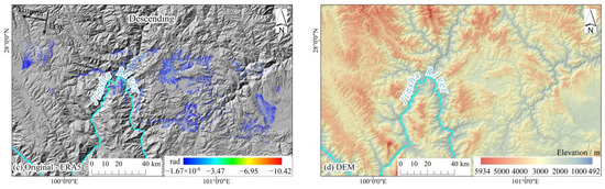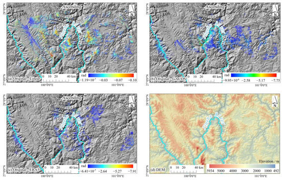 The spatial position distribution of the tropospheric delay overcorrected range in the non-deformation region of the descending tracks interferogram 20181204–20190121. (a–c) show the spatial distribution of overcorrected range after correction using different tropospheric delay methods; (d) DEM of the area.