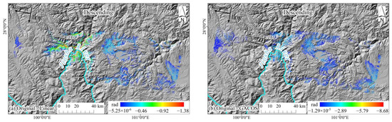 In Figure 8, the ascending and descending tracks had two days before and after their acquisition date, both from September to October. During this period, the time interval was short and they were in the same season. The deformation and seasonal differences between the two ascending and descending track interferograms can be ignored. From the original interference phase value and Pearson correlation coefficient, the correlation between the interference phase and elevation is different, even in the same region, owing to changes in atmospheric conditions at a similar time. The original interference phase value included the deformation and the tropospheric delay phases. The Pearson correlation coefficients r between the original interference phase and the altitudes of the ascending and descending tracks were 0.87189 and 0.90126, respectively. The interference phase had a strong correlation with the altitude. The linear correction method was far more sensitive to the vertical stratification delay than the GACOS and ERA5 methods, which significantly weakened the vertical stratification delay. The Pearson correlation coefficients of the ascending and descending tracks were reduced to 0.093356 and 0.34484, respectively, and the interference phase was either very weakly correlated with the elevation or had no correlation. After the three methods were used to remove the tropospheric delay phase, the correlation between the interference phase and elevation decreased significantly, indicating that the three methods weakened the vertical stratification component of the tropospheric delay and that it occupied a dominant position in this region. However, the ability of GACOS and ERA5 to capture the vertical stratification component was poor. In similar periods, the weakened performance for the vertical stratification delay was unstable, and the mitigation effect was different. The air in the troposphere mostly moves in a vertical direction and can be divided into lower (below 1500 m height above the ground), middle (about 1500–6000 m), and upper (about 6000–11,000 m) layers, according to air currents and weather phenomena. The cold air in the upper layer always has a sinking trend and the warm air in the lower layer always has a rising trend [27]. The correlation coefficient r decreases differently between GACOS and ERA5 methods in the ascending and descending interferograms. We speculate that the descending tracks SAR images were imaged in the morning, CST time, when the lower troposphere temperature is lower and the degree of vertical motion is slower, and the GACOS and ERA5 methods were less capable than the Linear method of correcting the vertical stratification delay at smaller scale.