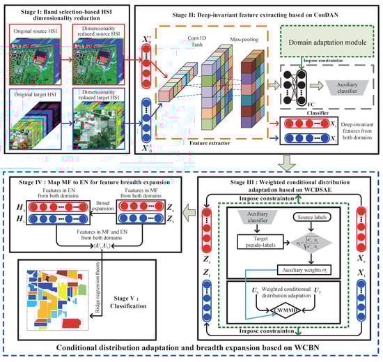 - Wang, H.; Wang, X.; Chen, C.; Cheng, Y. Hyperspectral image classification based on domain adaptation broad learning. IEEE J. Sel. Top. Appl. Earth Obs. Remote Sens. 2020, 13, 3006–3018. [Google Scholar] [CrossRef]