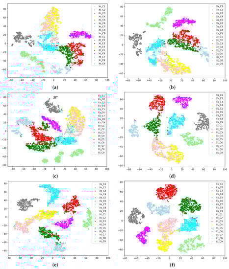 Illustrates the visualization of feature distribution. (a) Original features on BOT5-6 (b) Original features on BOT6–5 (c) Original features on BOT7–6 (d) CWDAN features on BOT5–6 (e) CWDAN features on BOT6–5 (f) CWDAN features on BOT7–6.