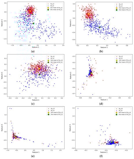 To further verify the effect of CWDAN, Figure 4 visibly shows the alignment results of Classes 2–4, i.e., Firescar, Island interior, and Riparian in the BOT5–6 data pair, where the data from different domains are displayed in circles with different colors, and the bigger orange and green rhombi represent the means of classes from the source and target domains respectively. It can be observed from Figure 4a–c that the distribution discrepancy between domains is large, since BLS does not apply the domain adaptation strategy. As shown in Figure 4d–f, with the help of CWDAN, the features of all three classes are better aligned and the centroids of the same class from different domains become closer.