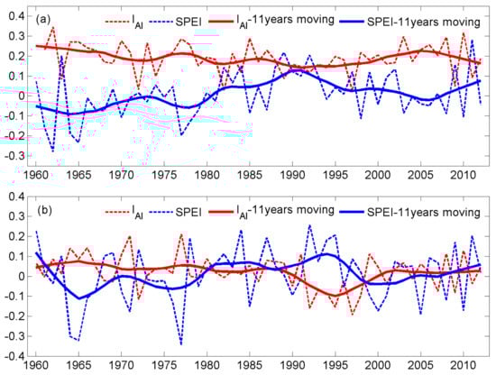 3.1. Differences between Climate Aridity Changes and Meteorological Drought Changes