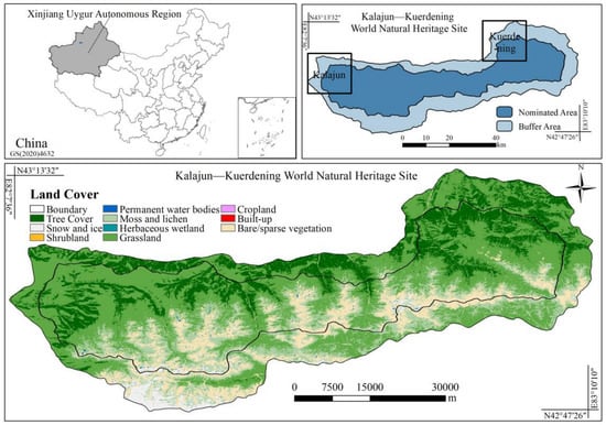 The Kalajun–Kuerdening heritage site is located in the central part of the Tianshan Mountains, in the Middle Tianshan Mountains in Xinjiang, with the overall topography being high in the south and low in the north. It is an integral part of the wild fruit forests in Central Asia as well as the origin and concentrated distribution area of wild apples, walnuts, European plums and other species. It is also a suitable habitat and source of global Schrenk spruce (Picea schrenkiana Fisch. et Mey.) []. Kalajun is the most prototypical representative of the Tianshan coniferous forest bioregion in the Central Asian Mountain Steppe and Woodland Ecoregions in Global 200 Ecoregions. Kuerdening is the most prototypical representative of the Tianshan Mountain Steppe Meadow bioregion (Figure 1).