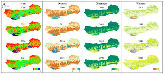 The detailed statistics of the four normalized impact factors of the EE index of the Kalajun–Kuerdening World Natural Heritage Site from 2006 to 2021 are shown in Table 3, and Figure 3 and Figure 4a. The normalized LST mean value representing the heat index decreases from 0.70 to 0.62, 0.65 and 0.60 in 2006, 2011, 2016 and 2021, respectively, indicating a decreasing trend of heat within the heritage site from June to September each year from 2006 to 2021. The high and cold weather is not conducive to vegetation growth [], validating the reasonableness of the decreasing RSEI values from 2006 to 2021. The high geothermal area in 2006 was mainly concentrated in the northeast (Kalajun) and northwest (Kuerdening) of the study site, and it was expanding by 2016. By 2021, the geothermal high-value area had decreased rapidly and remain concentrated in the study area’s northeast and northwest regions. From 0.57 in 2006 to 0.27 in 2021, the mean surface dryness decreased by 52.6%, showing a pronounced decreasing pattern overall. This indicator also fully justifies the obvious temporal variation pattern of the RSEI in the study. In contrast, the mean value of LSM decreased from 0.32 in 2006 to 0.22 in 2011. It increased to 0.34 in 2016 and 2021, showing a stable state. The average value of greenness decreased from 0.78 in 2006 to 0.75 in 2011 and then expanded to 0.77 in 2016 and 2021, demonstrating that plant growth in the study site remained stable and healthy from 2006 to 2021 with less fluctuation (Figure 3).