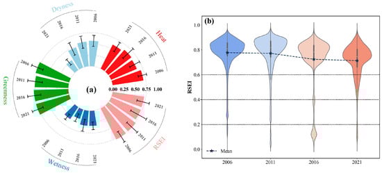 (a) Four factors and (b) RSEI statistics for 2006–2021.