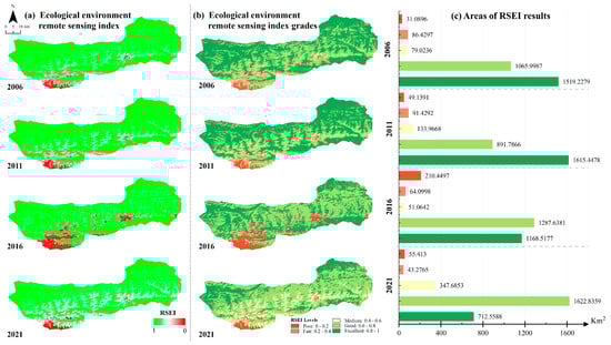 To further analyze the spatial distribution of the EE in the Kalajun–Kuerdening WNHS, the RSEI in the study site was divided into five classes [,,,]. Each level was in increments of 0.2, poor (level 1): 0 < RSEI ≤ 0.2; fair (level 2): 0.2 < RSEI ≤ 0.4; medium (level 3): 0.4 < RSEI ≤ 0.6; good (level 4): 0.6 < RSEI ≤ 0.8; excellent (level 5): 0.8 < RSEI ≤ 1.0.