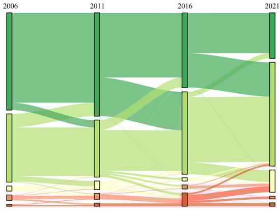 Based on the previous scholars’ studies on the ecological differences between different land uses [], we further analyze the relationship between land use and the ecological environment in terms of changes. This study uses the overlay analysis of land use pattern changes and EE quality changes for three periods, 2006–2011 2011–2016 and 2016–2021. There are uncertainties in the changes in EE quality caused by land use transformation. Future research should also study the common patterns between land use patterns and EE transformation by combining the characteristics of multi-period transformation.