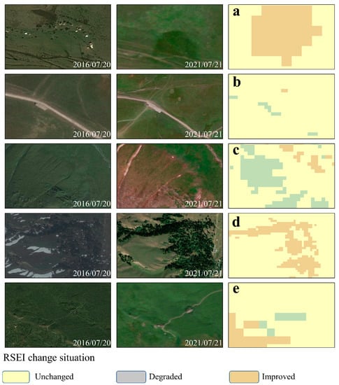 Case of comparative analysis of RSEI change images combined with World Imagery images. (a,b,e) Ecological changes in building and road areas. (c) Ecological changes in grassland areas. (d) Ecological changes in the forest area.