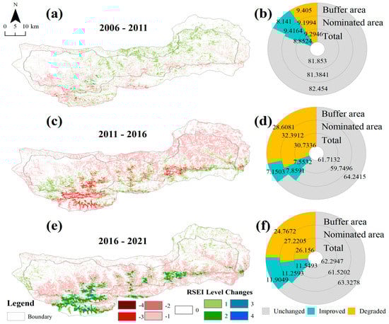 Spatial distribution of RSEI grade changes and statistics of changes in buffer area and nominated area. (a,c,e) Spatial distribution of RSEI grade changes, 2006–2011, 2011–2016 and 2016–2021. (b,d,f) The proportion of ecological environment.