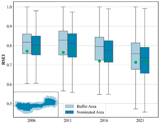 RSEI boxplot of buffer zone and nominated area from 2006 to 2021.