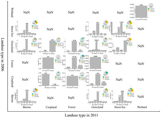 Statistics on the relationship between land use type change and ecological environment quality change from 2006 to 2011. NaN means there are no such observations. Taking the land use as barren in 2006 and as barren in 2011 as an example, we can see the shift area of the ecological class change caused by the barren–barren shift approach in the bar chart. At the same time, we can see the area proportion of ecological environment improvement or deterioration caused by the change in land use mode in the pie chart (bottom left corner of the figure).