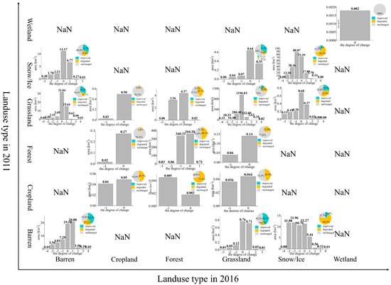 Statistics on the relationship between land use type change and ecological environment quality change from 2011 to 2016. NaN means there are no such observations. Taking the land use as barren in 2011 and as barren in 2016 as an example, we can see the shift area of the ecological class change caused by the barren–barren shift approach in the bar chart. At the same time, we can see the area proportion of ecological environment improvement or deterioration caused by the change in land use mode in the pie chart (bottom left corner of the figure).