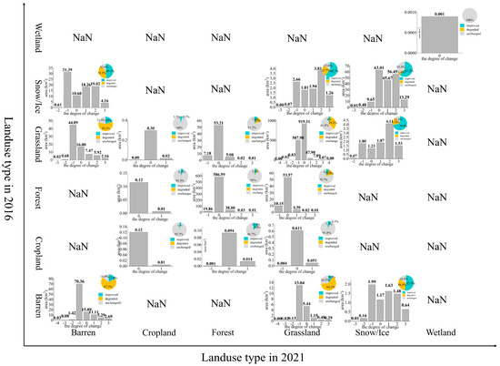 Statistics on the relationship between land use type change and ecological environment quality change from 2016 to 2021. NaN means there are no such observations. Taking the land use as barren in 2016 and as barren in 2021 as an example, we can see the shift area of the ecological class change caused by the barren–barren shift approach in the bar chart. At the same time, we can see the area proportion of ecological environment improvement or deterioration caused by the change in land use mode in the pie chart (bottom left corner of the figure).