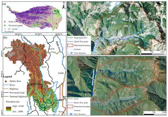 The Chuanxi Plateau is located in the eastern part of the Qinghai–Tibet Plateau and the middle part of the Hengduan Mountains, dominated by high mountain valley landscapes and is the intersection point of the first and second steps in China (Figure 1a,b). The altitude of the study area varies from 500 m to 4500 m, and the gradient varies between 10° and 50°. The relative height difference changes obviously, and the terrain deforms significantly. The region has strong neotectonic movements, significant uplift, and frequent earthquakes. Furthermore, the Xianshuihe Fault, Longmenshan Fault, Xiaojiang Fault, and Anninghe Fault distributed in the study area have led to significant weathering [,]. The Triassic strata in the study area are widely distributed, and the lithology is mainly composed of sandstone and slate. The annual rainfall is about 500–1400 mm. Under the influence of the southwest monsoon, the summer rainfall in this region is abundant and concentrated, and the rainfall from June to September accounts for 70–90% of the annual rainfall []. Under the combined influence of topography, geomorphology, tectonic movement, climatic conditions, and human activities, the study area is prone to debris flows.