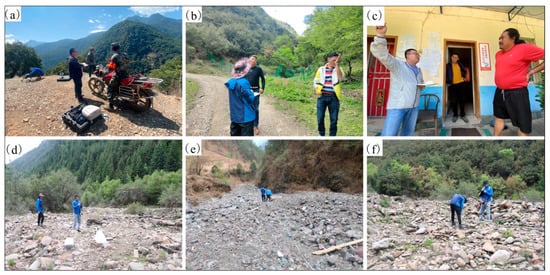 Field investigation of three typical debris flow gullies. (a–c) On-site survey and interviews in Yapi gully, Catuo gully, and Dakang gully. (d) UAV Flight in Dakang gully. (e,f) Field measurement of roundness in deposit fan.