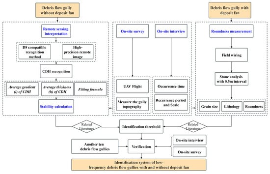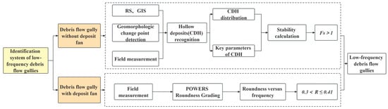 According to the abovementioned results, the identification system of low-frequency debris flow gullies was established (Figure 7). Here, the debris flow watersheds were classified into two categories according to the presence or absence of a deposit fan. For the first type of debris flow watershed without a deposit fan, the early identification and stability analysis of CDHs was used to identify the low-frequency debris flow gullies. The process is as follows: First, the CDHs in the watershed are determined by the geomorphic change point detection method combined with high-resolution remote sensing images (image resolution is 0.5 m, remote sensing data are from BIGEMAP: http://www.bigemap.com/ (accessed on 13 October 2021) and field investigation. Remote sensing images and field measurements are used to determine the key parameters (average gradient and thickness of CDH). Lastly, the stability (Fs) of the CDHs is calculated. When FS > 1.0, the CDH is stable, and the watershed can be defined as a low-frequency debris flow gully. In addition, the roundness of debris flow deposits is an important basis for identifying low-frequency debris flow. It has been found that the larger the roundness value of the stones in the debris fan, the lower the debris flow frequency []. Therefore, the roundness of stones in the deposit fan for the second type of debris flow watershed deposit fan is calculated through field measuring. Additionally, the relationship between roundness and recurrence of debris flow (Table 4) was used for the early identification of low-frequency debris flow.