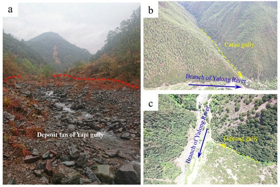 Typical deposit fan in the study area. (a) Field investigation of the Yapi gully deposit fan, (b) UAV photography of the outlet of the Catuo gully, (c) UAV photography of the outlet of the Dakang gully.