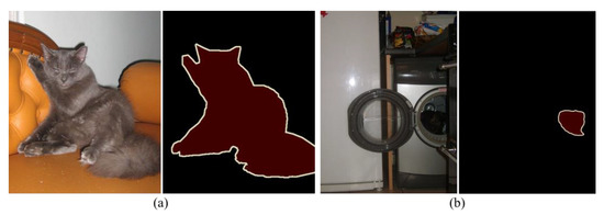 Figure 2 shows the difference between a camouflaged object and a generic object. Both pictures are marked with cats, (a) taken from the general object dataset PASCAL VOC and (b) taken from the COD dataset COD10K. As can be seen, COD is more difficult than SOD. In the introduction, we also discussed that generic object detection networks usually lack the ability to detect camouflaged objects. In recent years, deep learning techniques have advanced abruptly, and scholars have applied them to the field of camouflage object recognition. In 2020, Fan et al. established a universal camouflaged object dataset called COD10K, which has promoted the accelerated application of deep-learning-based camouflaged object recognition approaches [30]. In 2021, Mei et al. proposed a camouflaged object recognition network called the positioning and focus network (PFNet) based on the principle of distraction mining to simulate animal predation in nature [31]. Jiang et al. also proposed a camouflaged object segmentation network called the magnifier network (MAGNet) based on a simulated magnifying glass observation effect with the help of the bionic principle [32]. In the same year, Lv et al. proposed a new camouflaged object segmentation dataset called NC4K and proposed a network that can simultaneously perform localization, segmentation, and camouflage effect ranking [33]. In 2022, Pang et al. proposed a mixed-scale triadic model called the zoom-in and -out network (ZoomNet) by mimicking the human behavior of zooming in and out when observing blurred images; this is the state-of-the-art model in the field of camouflaged target segmentation [34].