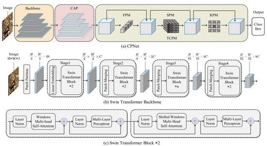 The structure of the proposed CPNet for COD is shown in Figure 3a. The CPNet sequentially cascades the feature extraction backbone, the CAP, the TCPM, and the detection output head. The feature extraction backbone downsamples the input image to 1/4, 1/8, 1/16, and 1/32 of the original size and then inputs the four sets of feature maps into the CAP for feature fusion. The CAP outputs four 3D tensors, which are then fed into the TCPM for information perception, and the object class and object bounding box information is finally output.