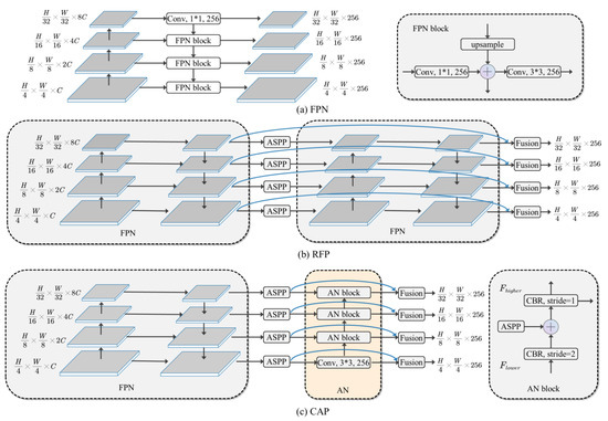 The CAP changed the secondary training part of the RFP to an aggregation network (AN). First, the lower-level feature map is downsampled using the convolutional layer combination of convolution + batch normalization + Relu activation function (CBR) with a step size of 2. It aggregates low-level representations and obtains higher-lever :