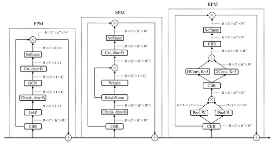 The TCPM was built based on the characteristics of camouflaged objects, and it includes a feature perception module (FPM), a spatial perception module (SPM), and a key point perception module (KPM), which are embedded into the network in a cascaded manner. The structure of the TCPM is shown in Figure 5.