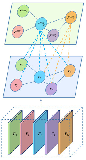where represents the operation of the global average pooling the input feature map into a feature map with W = 1 and H = 1. Then, the four-dimensional tensor output of GAP is truncated into B three-dimensional tensors. In the CNN, the number of channels C represents the number of features extracted from the feature map, so the B three-dimensional tensors can be considered as a point set of C features. The GCN (a CNN that is capable of obtaining relationship information) is used to further obtain the relative relationship between the feature nodes. Its schematic is shown in Figure 6. Suppose there are five feature tensors –, which are regarded as five nodes, and each node carries its neighbor information by GCN (for example, carries the information of the 2 nodes adjacent to it to form after the GCN).