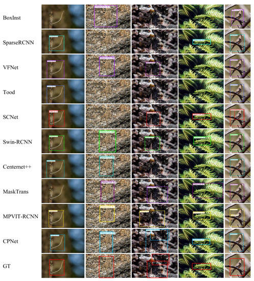 Qualitative comparison: From the quantitative analysis, it is clear that the metrics of the algorithms after 2021 gradually occupied the top three spots, so we selected the models after 2021 for visual comparison. Figure 10 shows the visualization results obtained by cross-sectional comparison experiments when using a large backbone. It can be seen that the CPNet proposed in this paper was more robust than the other methods. The FPM in the TCPM could extract the relationship information between features so that the algorithm better identified the interesting parts of the object that were difficult to identify, such as tentacles and tails (e.g., columns 1–2). The SPM in the TCPM could obtain the spatial information of the camouflaged object to improve the accuracy of the object bounding box and accurately detect multiple targets (e.g., columns 3–4). The KPM could extract the location information of the key points to locate targets precisely; thus, it reduced the false alarm and prevented bounding box selection from being repeated (e.g., column 5).