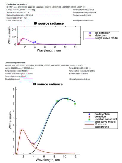 Two types of the spectral fitting in VNF. Single heat source spectrum is fitted when no signal detected in MWIR bands (top). Sum of the heat source and the background fitted when MWIR signal detected (bottom).